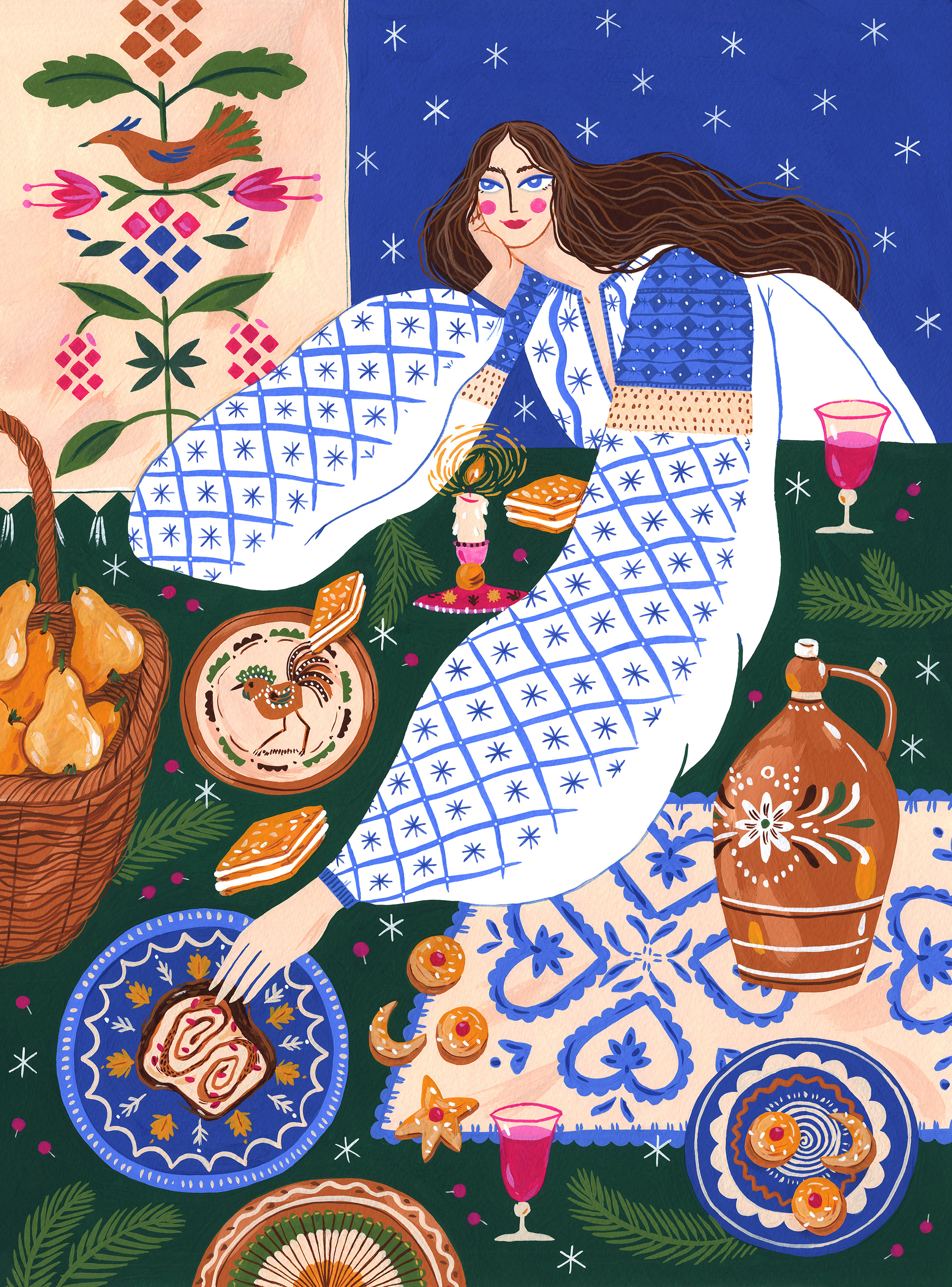 for their "Un Conte d'Hiver Roumain" collection featuring Romanian traditional objects (traditional shirt, tapestry, ceramics, tableware, basket)