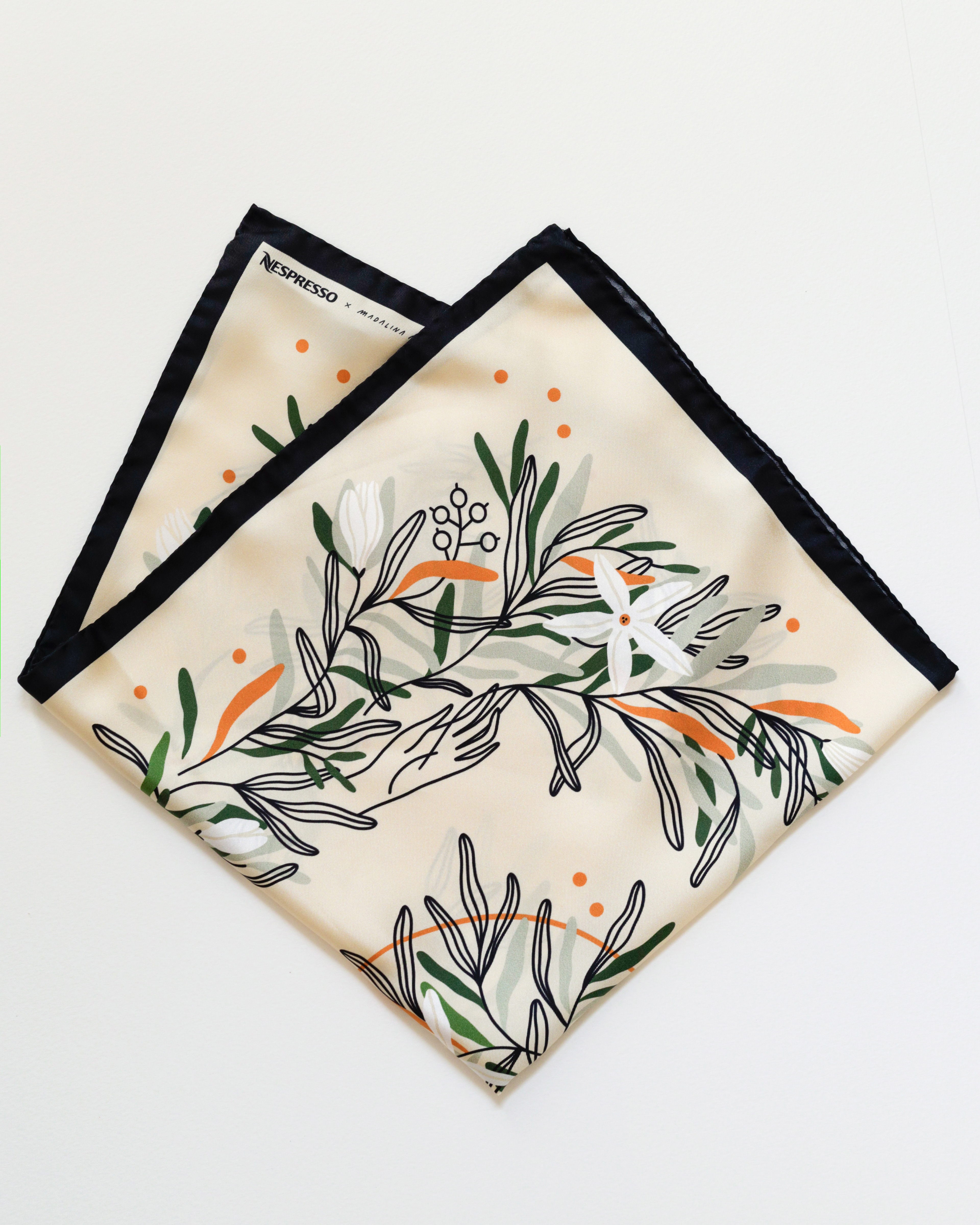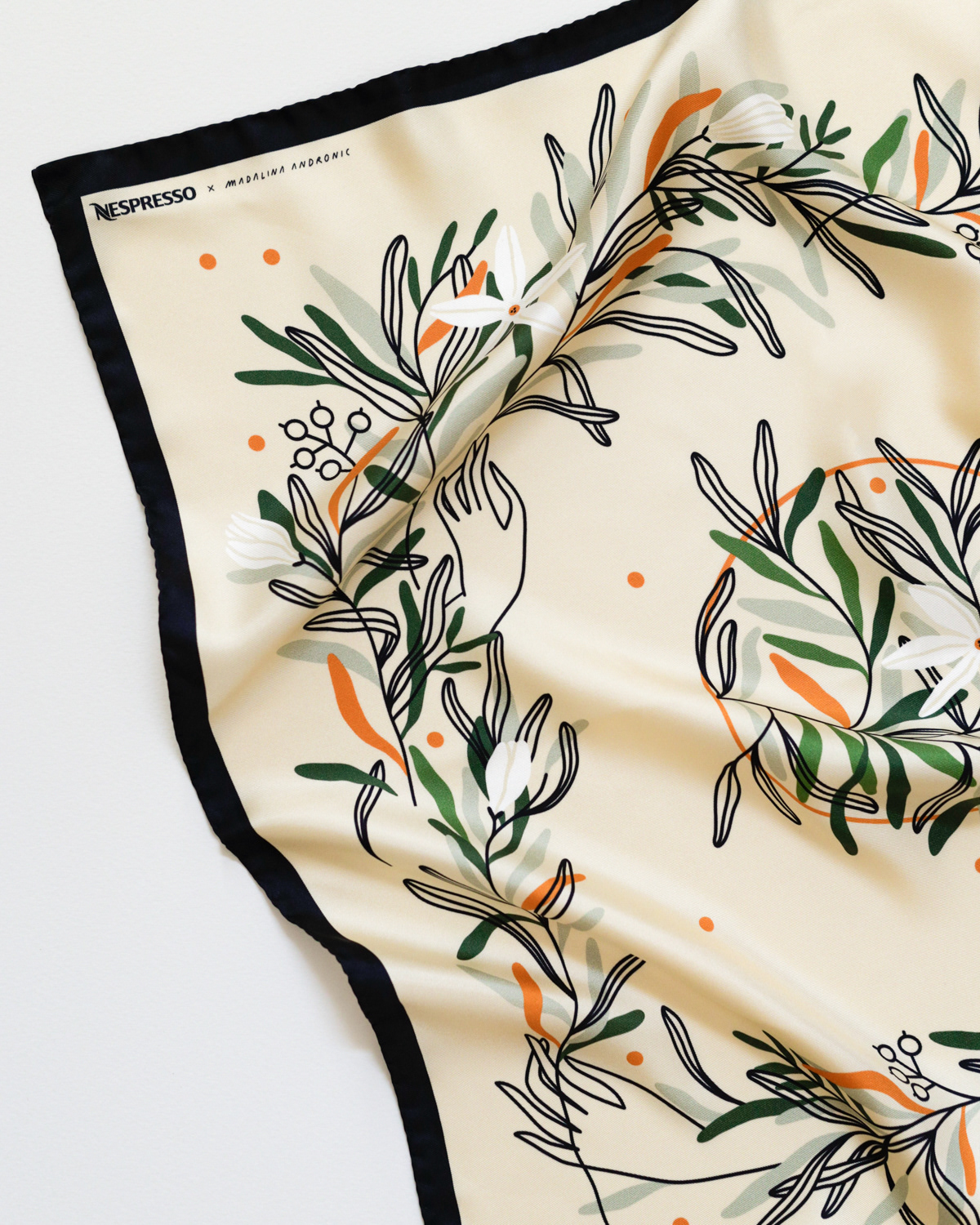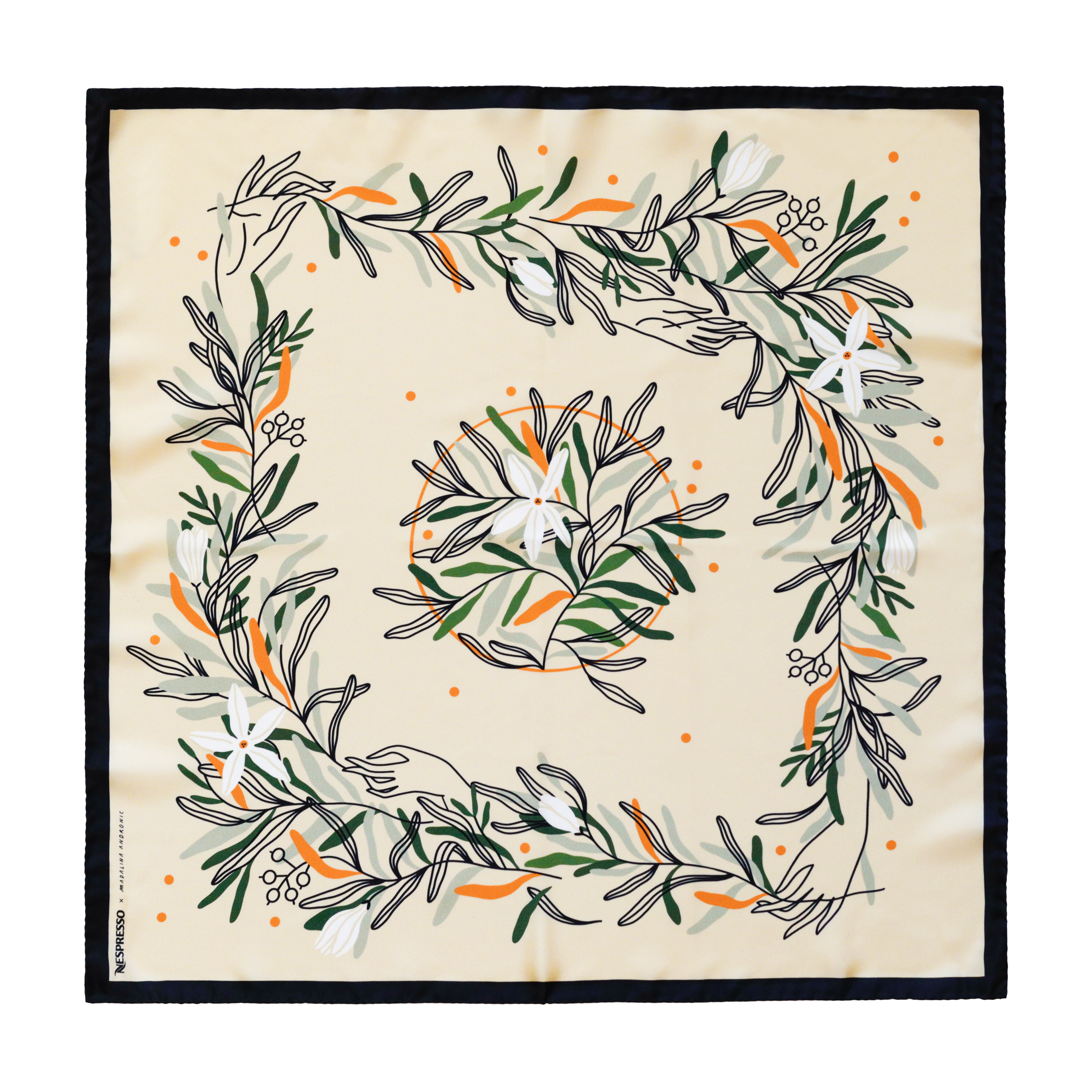 Inspired by Nespresso's attention to sustainability, this scarf is a metaphor for the Nespresso pods: the special way in which people are encapsulating the richness and taste of a continuously evolving nature, transforming it into a precious experience to enjoy at the touch of a button.