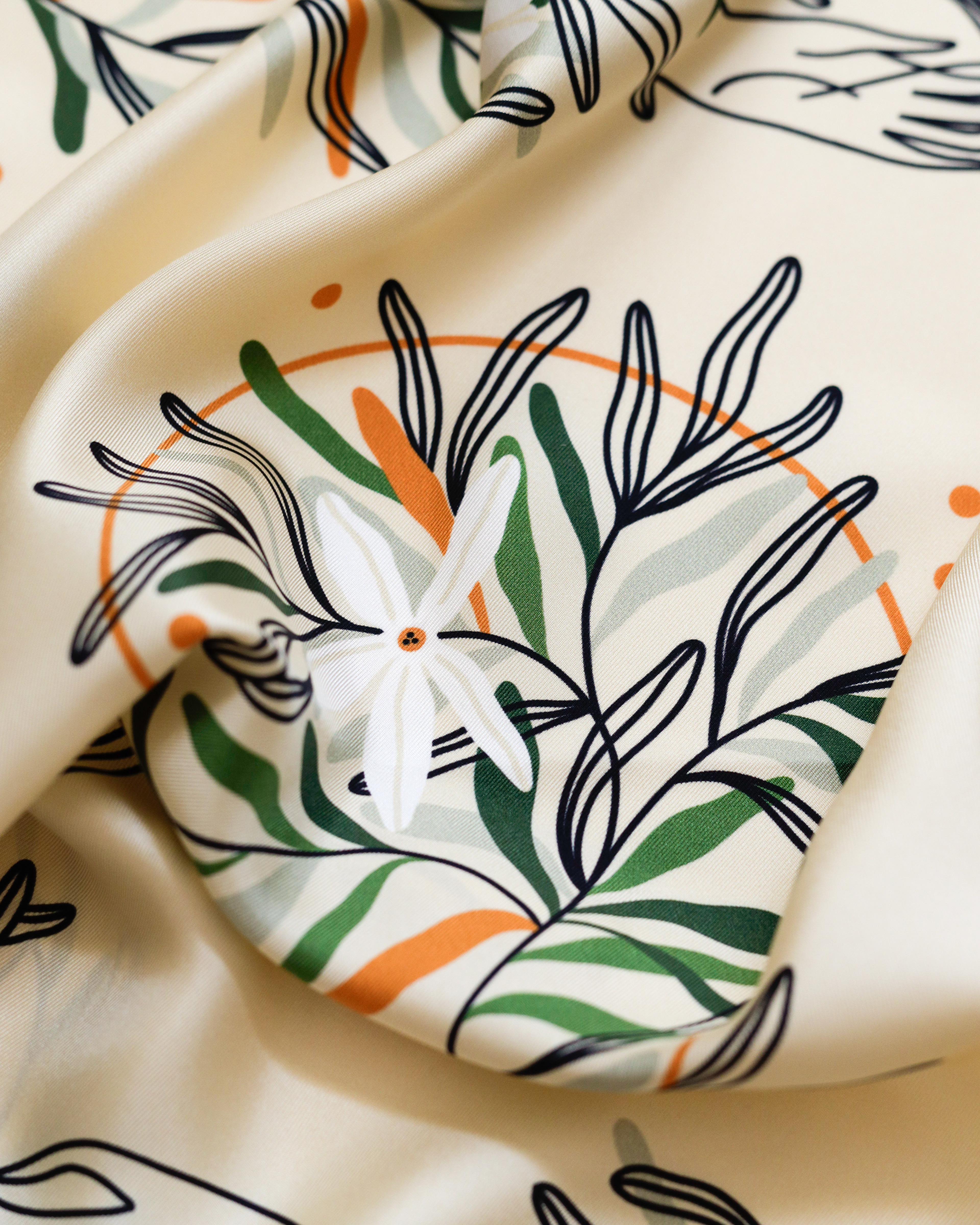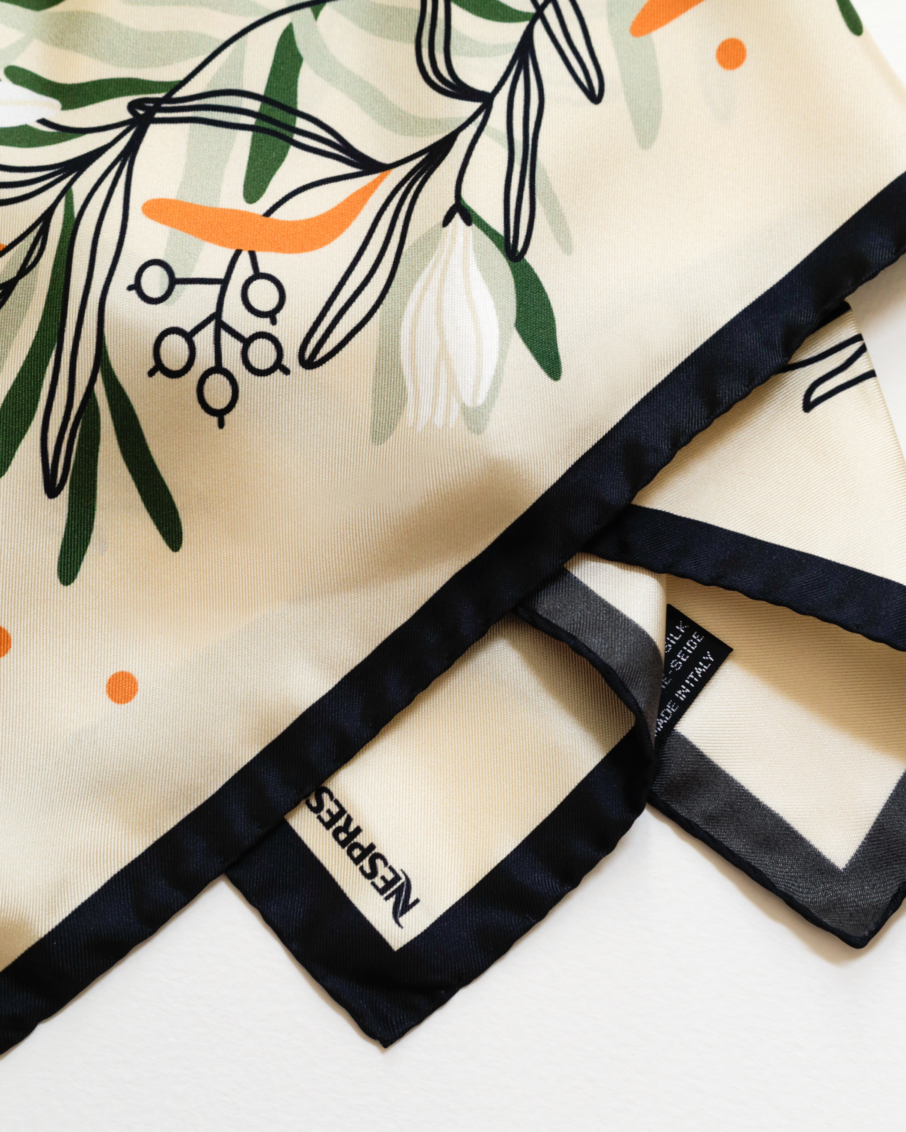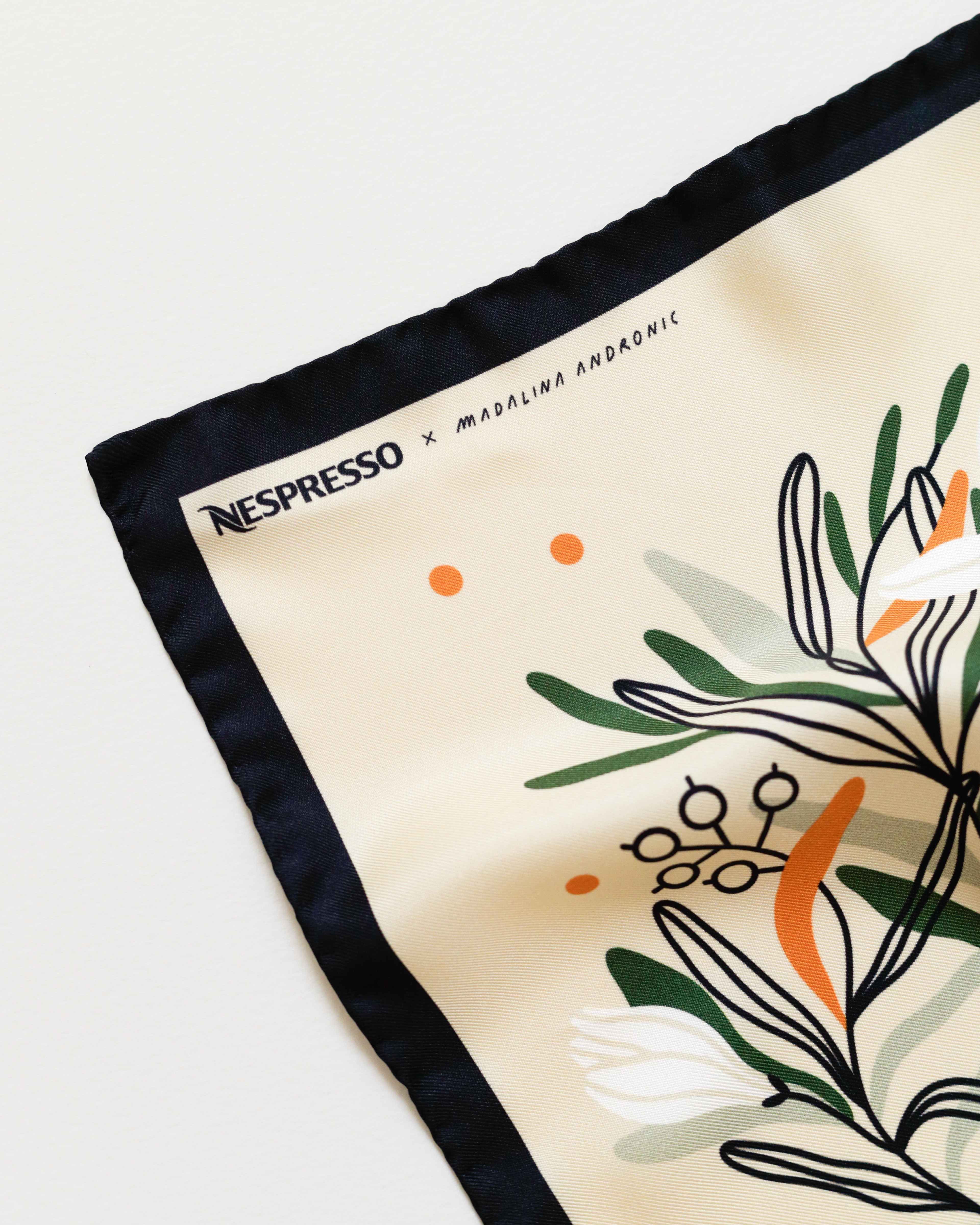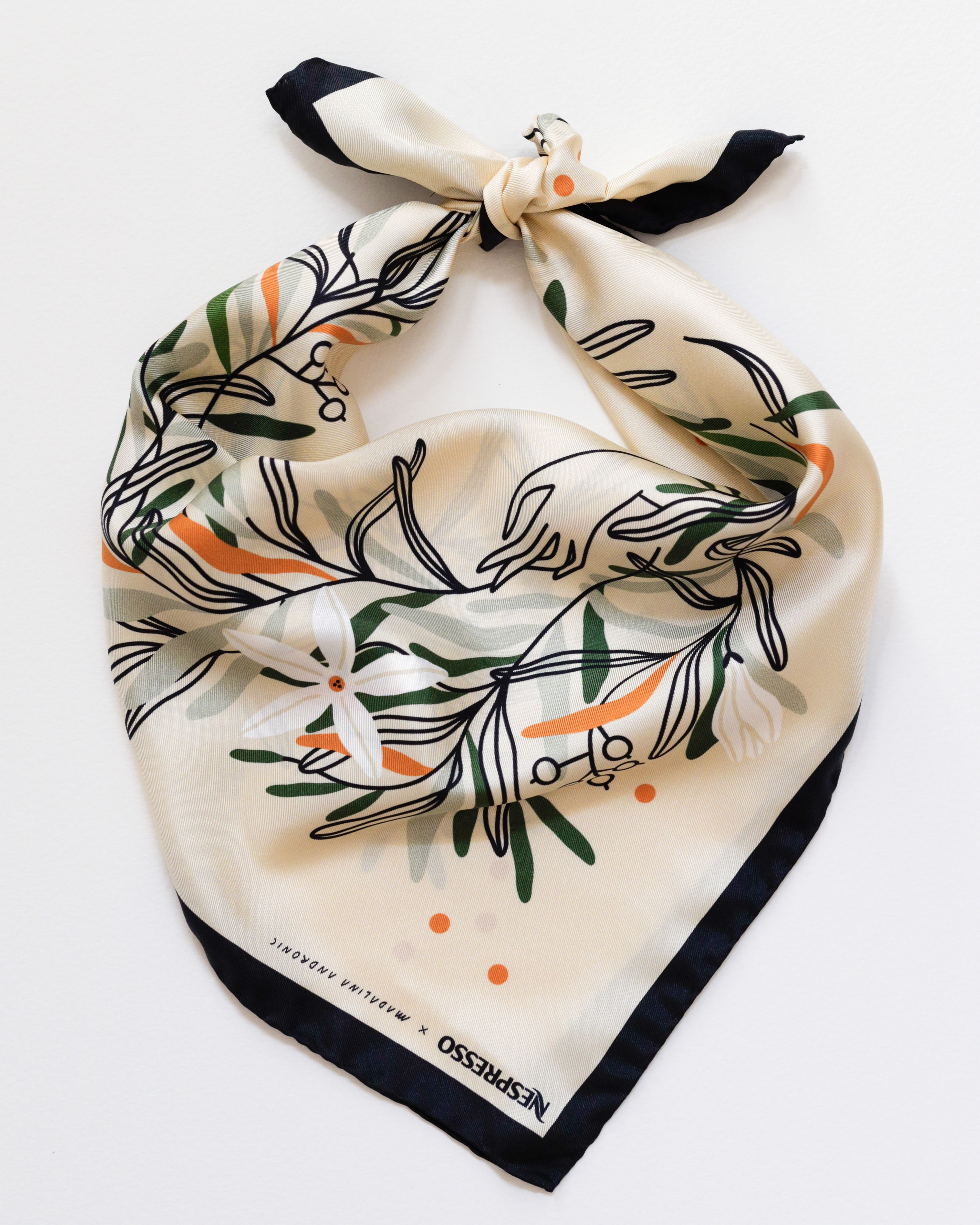 Inspired by Nespresso's attention to sustainability, this scarf is a metaphor for the Nespresso pods: the special way in which people are encapsulating the richness and taste of a continuously evolving nature, transforming it into a precious experience to enjoy at the touch of a button.